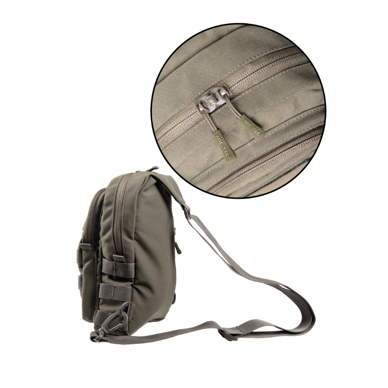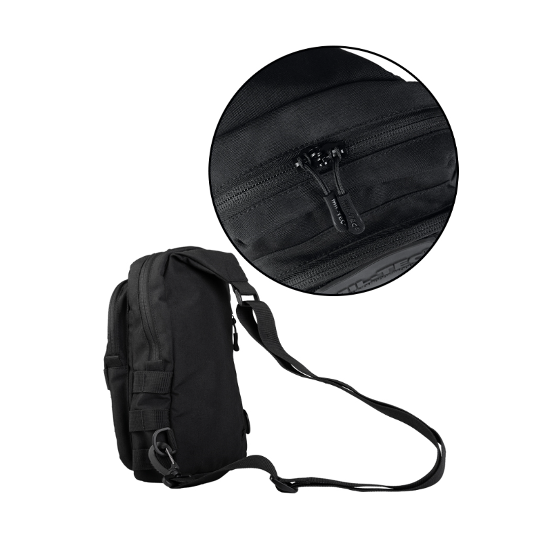 Τσαντάκι στήθους με ρυθμιζόμενο ιμάντα για εύκολη προσαρμογή της εταιρείας Mil-Tec σε δύο χρωματισμούς χακί ή μαύρο. Υπάρχει η δυνατότητα να φορεθεί αμφιδέξια ανάλογα με την προτίμηση του χρήστη αλλάζοντας το κλιπ. Διαθέτει τρεις τσέπες που ανοίγουν με φερμουάρ. Η κύρια τσέπη έχει με φερμουάρ δύο κατευθύνσεων και διαθέτει δύο εσωτερικές τσέπες. Η μικρότερη θήκη πιο μπροστά ανοίγει με φερμουάρ για τοποθέτηση μικρότερων αντικειμένων και η μπροστινή τσέπη φέρει εξωτερικά velcro για τοποθέτηση σημάτων ενώ εσωτερικά έχει τσέπη με δίχτυ.