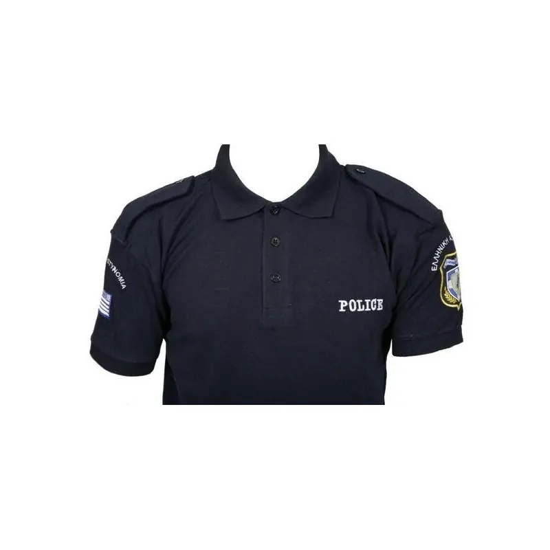 Μπλουζάκι Polo 200gr μπλε σκούρου χρώματος με επωμίδες. Είναι προϊόν Ελληνικής Κατασκευής με κοντό μανίκι και κέντημα στο πίσω μέρος της πλάτης Ελληνική Αστυνομία/Police. Στα μανίκια φέρει όλα τα απαραίτητα κεντήματα καθώς και στο εμπρόσθιο μέρος της αναγράφει POLICE. Είναι προβλεπόμενο 100%.