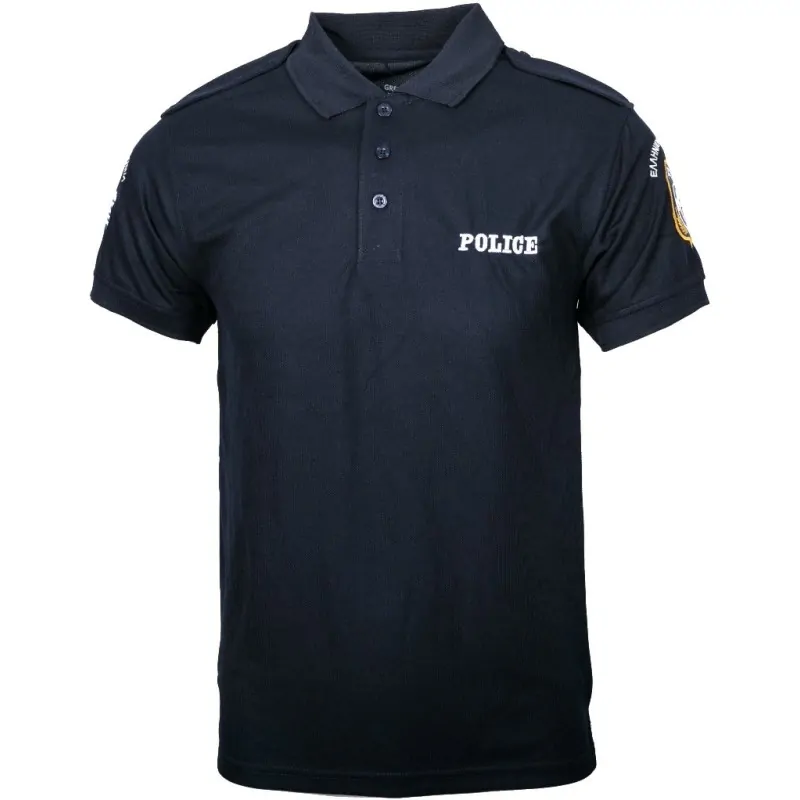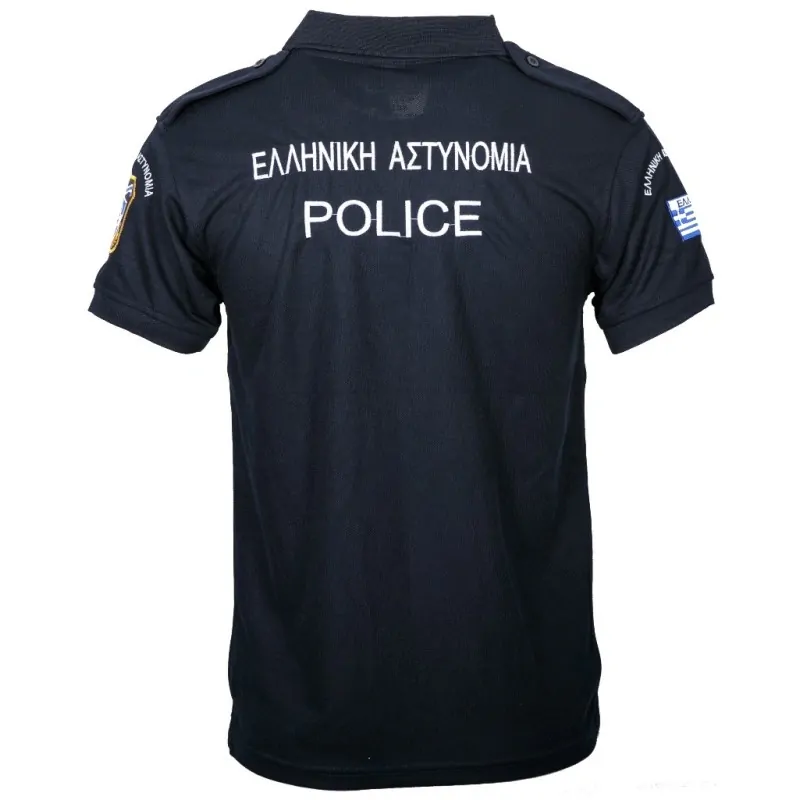 Μπλουζάκι Polo 185gr μπλε σκούρου χρώματος με επωμίδες. Είναι προϊόν της εταιρείας Greek Force με κοντό μανίκι και κέντημα στο πίσω μέρος της πλάτης Ελληνική Αστυνομία/Police. Στα μανίκια φέρει όλα τα απαραίτητα κεντήματα καθώς και στο εμπρόσθιο μέρος της αναγράφει POLICE. Είναι προβλεπόμενο 100%.