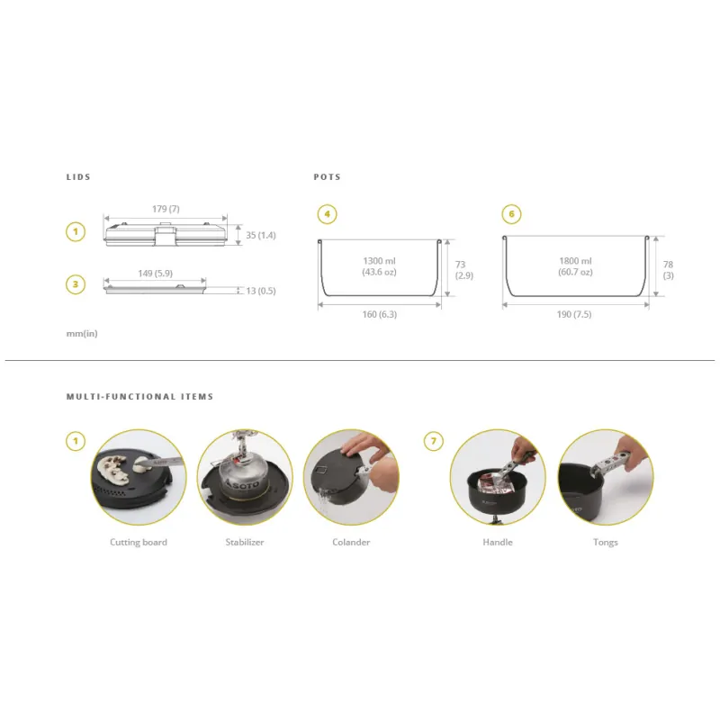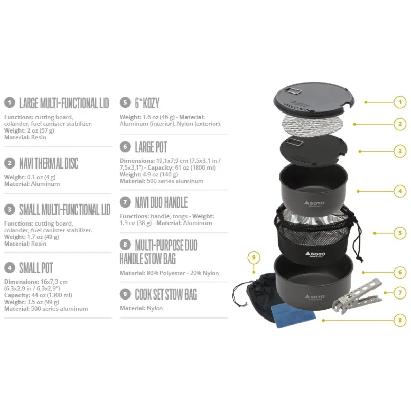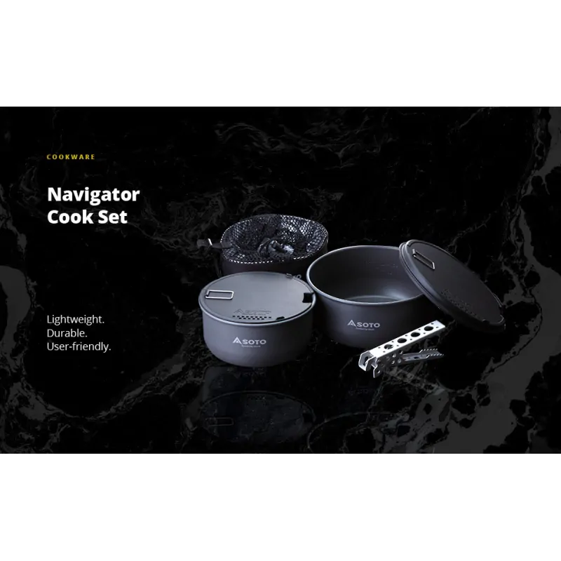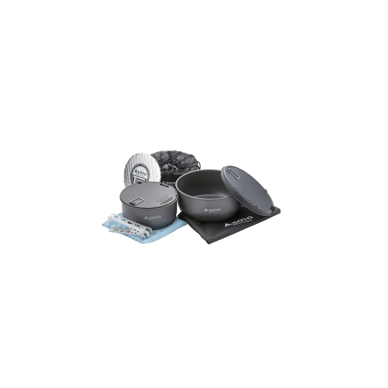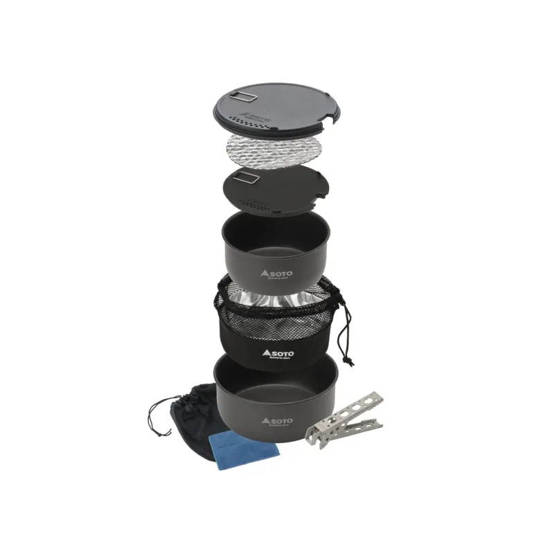 Το φορητό μαγειρικό σετ αλουμινίου της Ιαπωνικής εταιρείας Soto Outdoors, προσφέρει μια πλήρη λύση για το μαγείρεμα και την αποθήκευση των τροφίμων σας κατά τις εξορμήσεις σας στη φύση. Κατασκευασμένο από εξαιρετικά σκληρό ανοδιωμένο αλουμίνιο, το σετ αυτό είναι σχεδιασμένο για να αντέχει στη διάβρωση, τη φθορά και τους κραδασμούς, προσφέροντας αξιόπιστη απόδοση και μακροχρόνια χρήση σε δύσκολες συνθήκες. Καθαρίζεται εύκολα και παρέχει αρκετό χώρο για αξιοπρεπείς ποσότητες φαγητού για 1-3 άτομα. Όλα τα μαγειρικά σκεύη του σετ μπορούν να στοιβάζονται το ένα μέσα στο άλλο.
