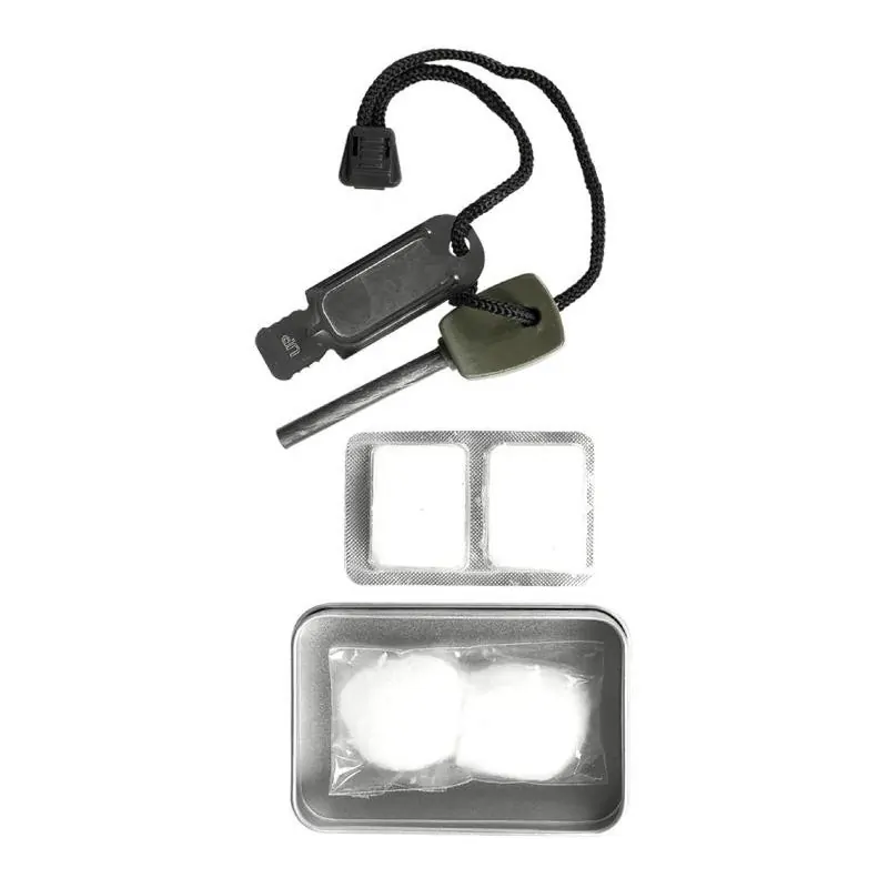 Το σετ περιλαμβάνει μίνι-σπινθηριστή με ferrocerium, υλικό που με μεγάλη ευκολία μπορεί να δημιουργήσει σπίθες ικανές να ανάψουν το βαμβάκι ή ξερά φύλλα. Επίσης δύο ταμπλέτες με εύφλεκτο υλικό και δύο κομμάτια βαμβάκι που εσωκλείονται σε ατσάλινο κουτάκι με διαστάσεις 9,3x6,2x2,7cm και συνολικό βάρος 90g.