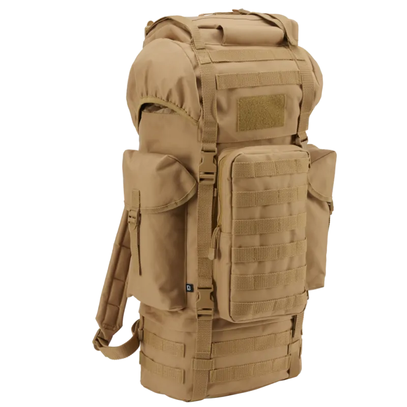 Το σακίδιο πλάτης της εταιρείας Brandit είναι σχεδιασμένο με ανατομική πλάτη ώστε να βοηθάει το χρήστη στη μεταφορά μεγάλου βάρους. Έχει χωριτικότητα 66 λίτρα με δύο πλαινές τσέπες και μία μπροστά.