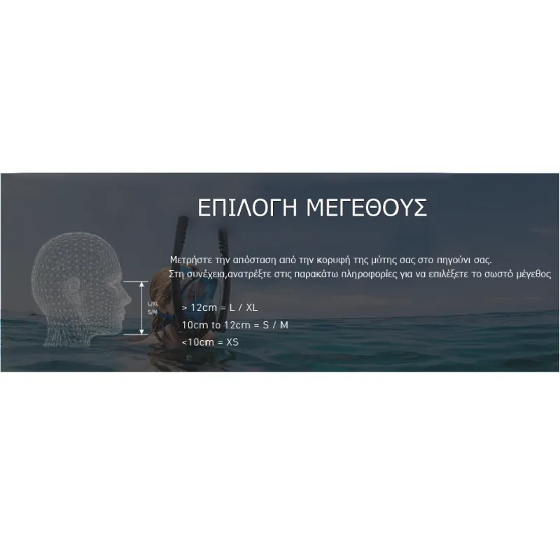 Για την σωστή επιλογή του μεγέθους της μάσκας μετρήστε την απόστατη από την κορυφή της μύτης μέχρι το πηγούνι σας και επιλέξτε ανάλογα, θα σας βοηθήσει και η σχετική εικόνα.