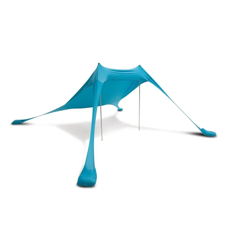 Ελαστικό σκίαστρο παραλίας για γρήγορο και εύκολο στήσιμο χωρίς καθόλου κόπο καθότι στείνεται πολύ εύκολα  τεντώνοντας το πανίκ και τοποθετώντας τους ορθοστάτες στις δύο άκρες. Για σταθεροποιήση γεμίζετε με άμμο ή πέτραες τις ειδικά σχεδιασμένες θήκες στις τέσσερις γωνίες.