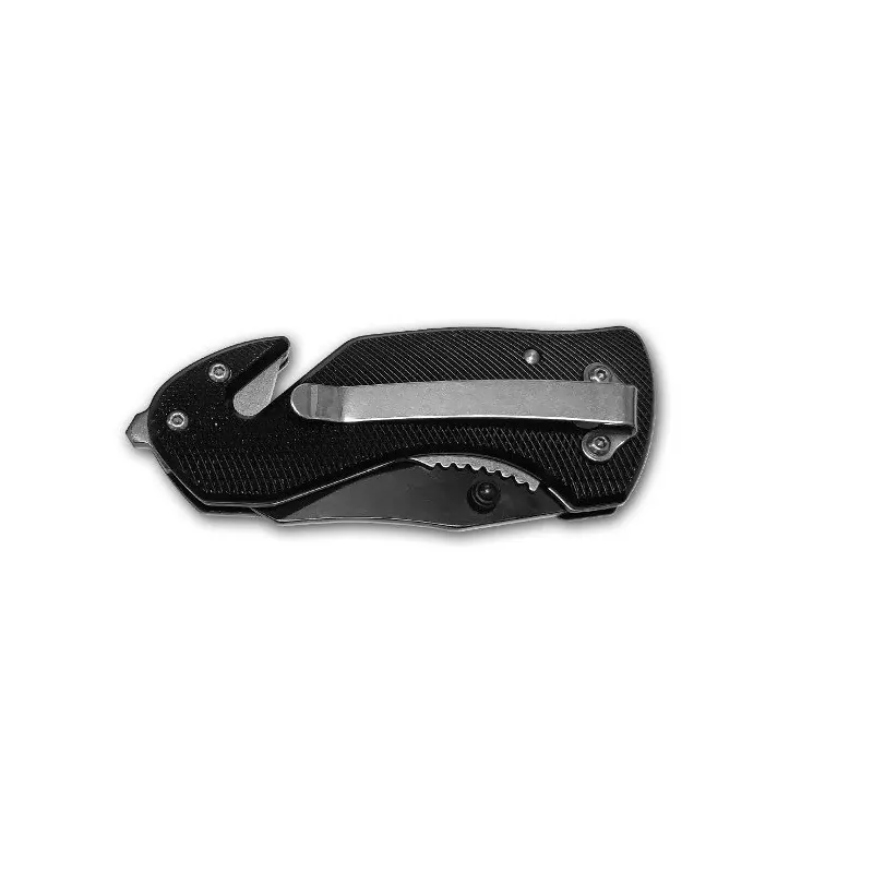 Folding rescue knife of the company Alpin, Tactical series, in black color. Ideal for some of your equipment or for outdoor activities such as camping or hunting. It is small in size and you can attach it to your pocket belt or backpack from the belt clip on the back.