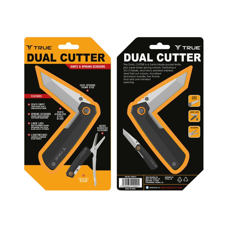 The True Utility Dual Cutter Pocket Knife is an ideal choice for everyday use. The blade and scissors are made of 3Cr13 stainless steel for maximum durability, while the handle is made of anodized aluminum for greater stability. It features a spring-loaded scissors and the knife opens and closes with one hand.