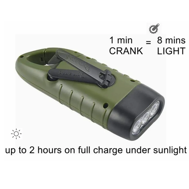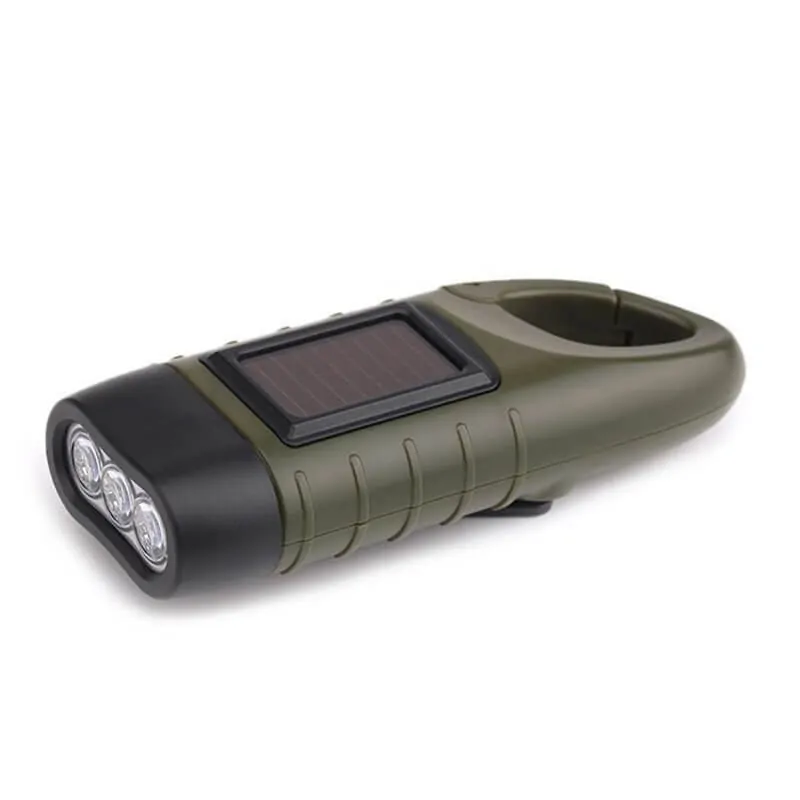 Φακός με ηλιακή και χειροκίνητη φόρτιση για το camping, το κυνήγι και το ψάρεμα. Διατίθεται σε χακί χρώμα με διακόπτη On/Off και κλιπ για εύκολη τοποθέτηση σε διάφορα σημεία.
