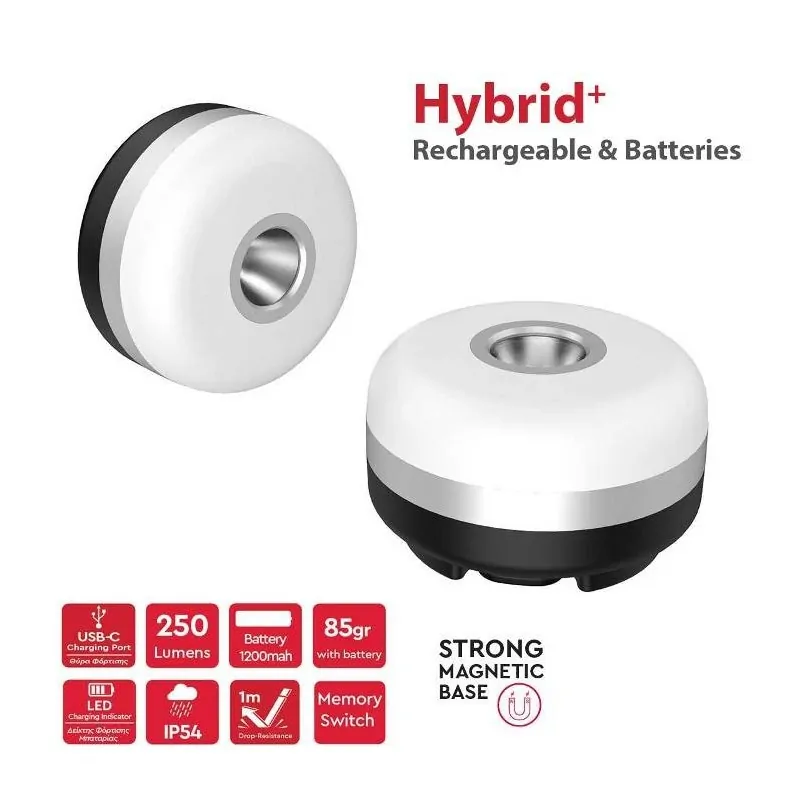 AlpinPro waterproof SimLite Hybrid flashlight with rechargeable battery. It provides double lighting, diffusers for room lighting and spots for distance. On the back side it has a magnet that allows you to stick it to surfaces like the fridge, a hook so you can hang it wherever you want and a Type-C charging port on the battery. Its dimensions are 66 x 66 x 40.5cm and the weight is only 86g including the battery.