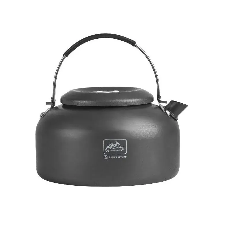 Large camp cup made of hard-anodized aluminum. May be heated on gas cookers or over fire. Has a lid, folding handle, wide enough to fit 1-liter Nalgene bottle.