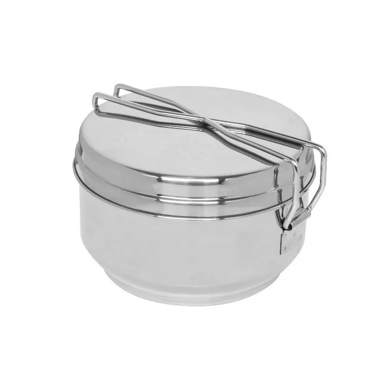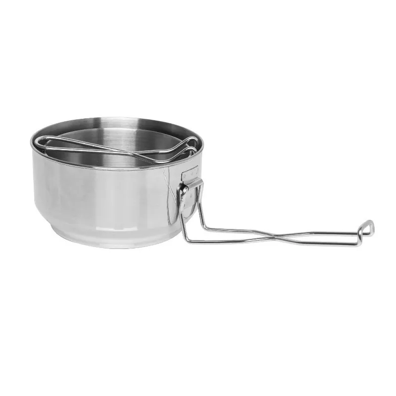 Made of stainless steel with folding handles to store inside each other for less space and easier storage. An ideal solution for military exercises and for lovers of outdoor activities. Its dimensions are 10x15.5cm and it weighs 700gr. The large container has a diameter of 15cm and a capacity of one liter, while the smaller one has a diameter of 13cm and a capacity of 700ml.