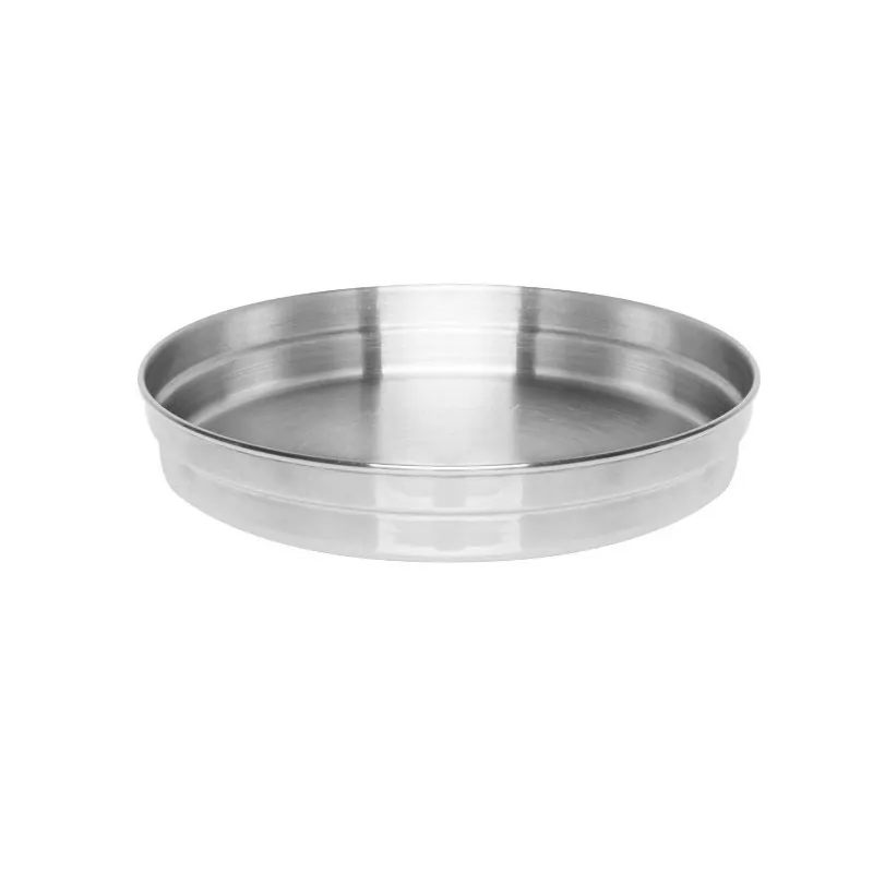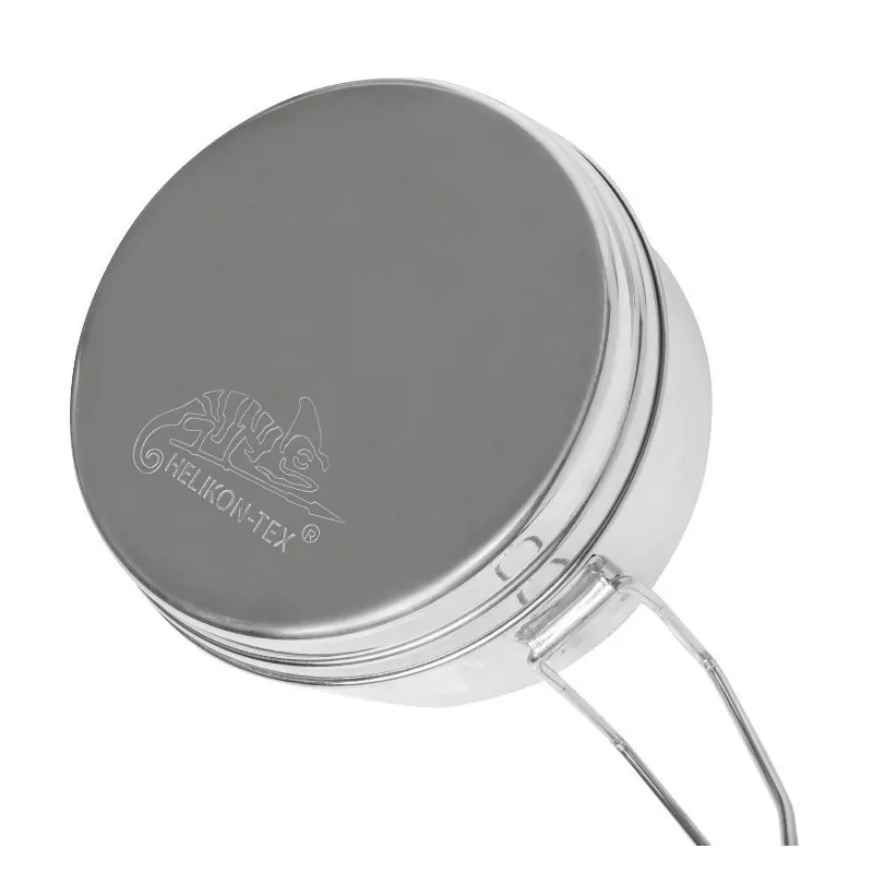 Helikon-Tex stainless steel dining set in metallic color which is a replica of the Czech army cookware. It consists of a large container with a lid that you can use as a plate and a smaller container.