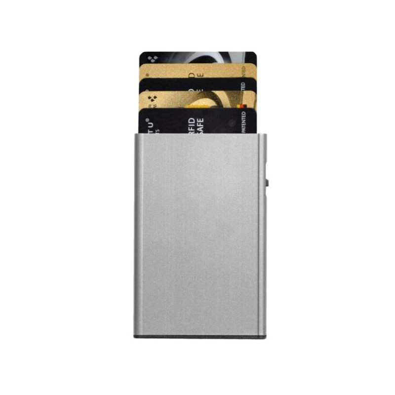 The Arrow Card Holder by Tru Vitru with "CLICK & SLIDE" technology, where with just a touch of your thumb, your cards automatically slide out in a staggered position. Made of aluminum for protection against illegal scanning of personal data RFID/NFC scanning and demagnetization. Designed with space for up to 5 plastic cards.