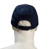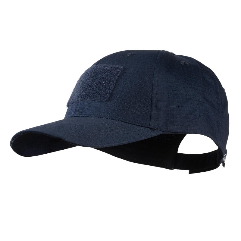 Jockey cap in blue color by the company Survivors with velcro on the front, top and back section for placing national emblem, flag, blood type, etc. It is made of 65%/35% Poly/Cotton in Rip-Stop form. It has small holes to ventilate the head. It is one size and adjustable with the velcro it has on the back.