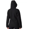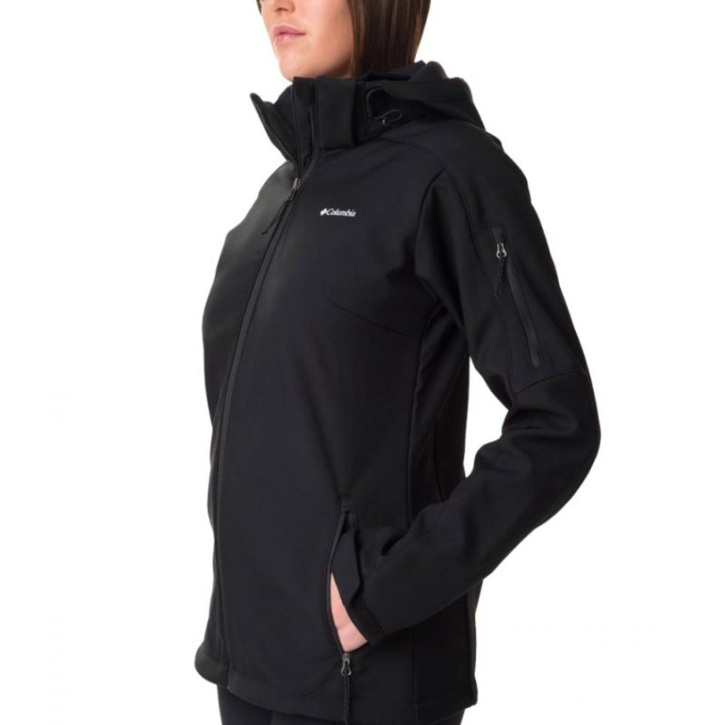 Women's Softshell Cascade Ridge II by Columbia, suitable for hiking and everyday use. Made from 100% polyester, it features a detachable hood for added user convenience. It includes a chin guard, a zippered sleeve pocket, and adjustable cuffs.