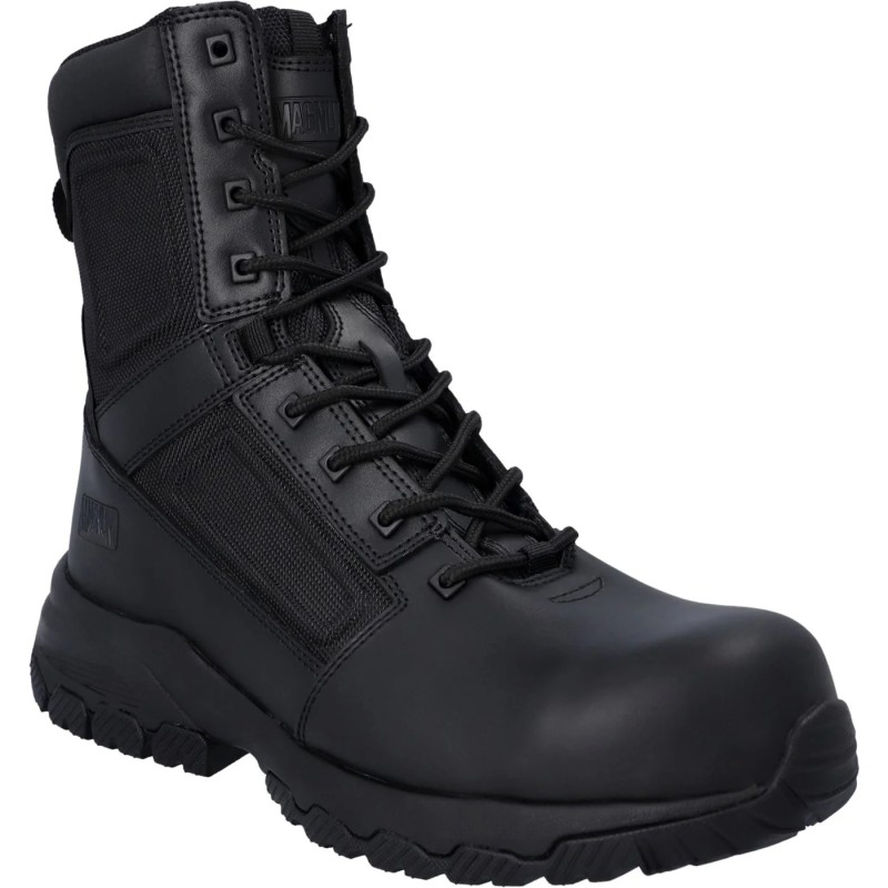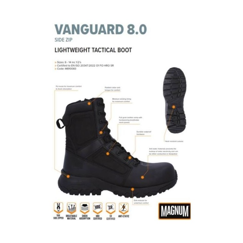 The Vanguard 8.0 SZ boot from Magnum is waterproof and suitable for all weather conditions. Ideal for security professionals, military personnel, and demanding users. Designed with a leather upper for maximum protection. It features an internal lining that allows the foot to breathe and a side zipper for easy application. The sole is non-slip for excellent grip, with a lightweight and comfortable design for exceptional traction.