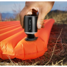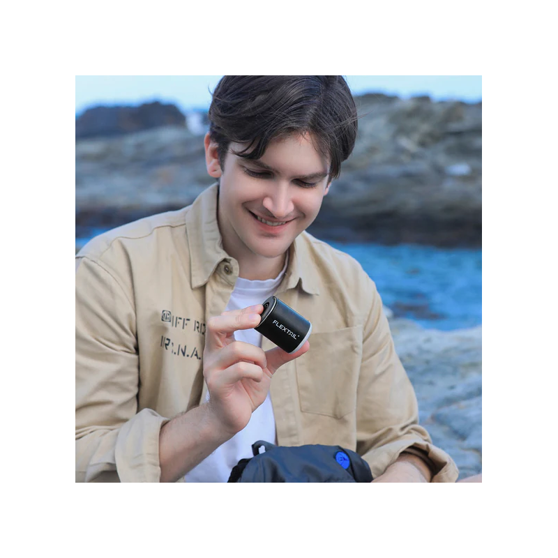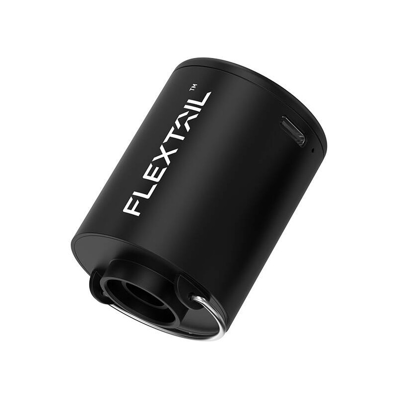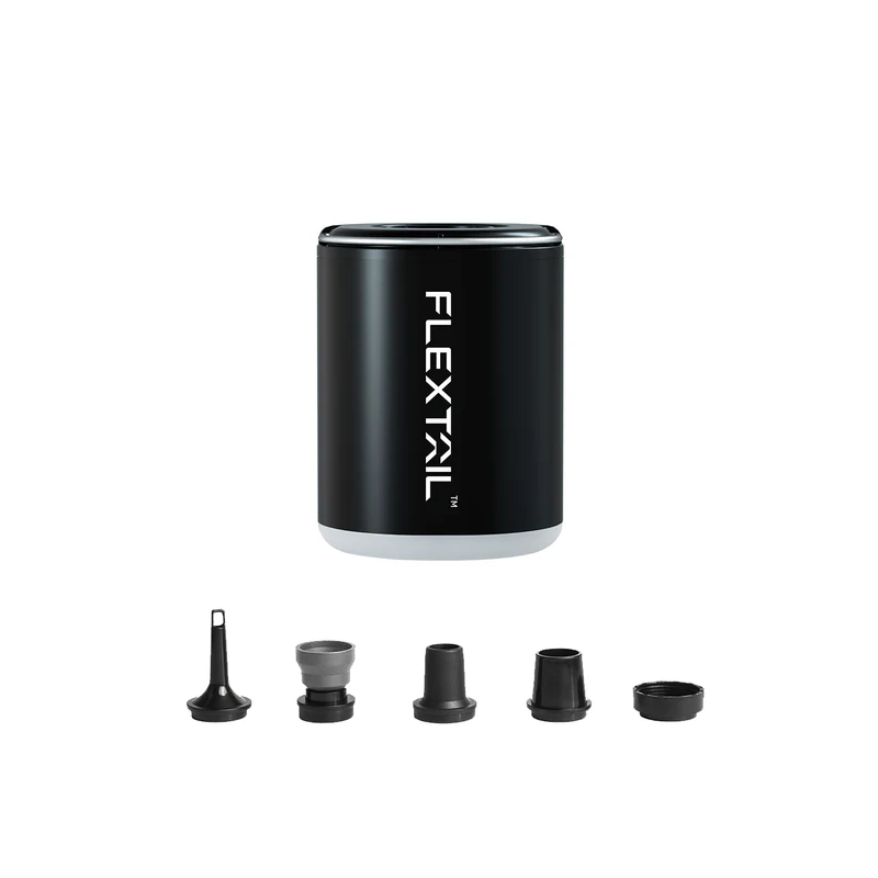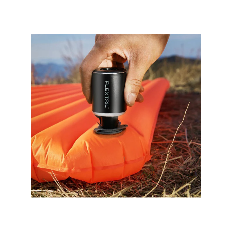 Rechargeable 2X 3in1 Pump by Flextail suitable for all air mattresses, inflatable water toys, and camping mats. Constructed with a rechargeable 1600 mAh battery, it features a deflation function that can be used on Vacuum bags for air removal or as a blower for starting a fire or as a flashlight.