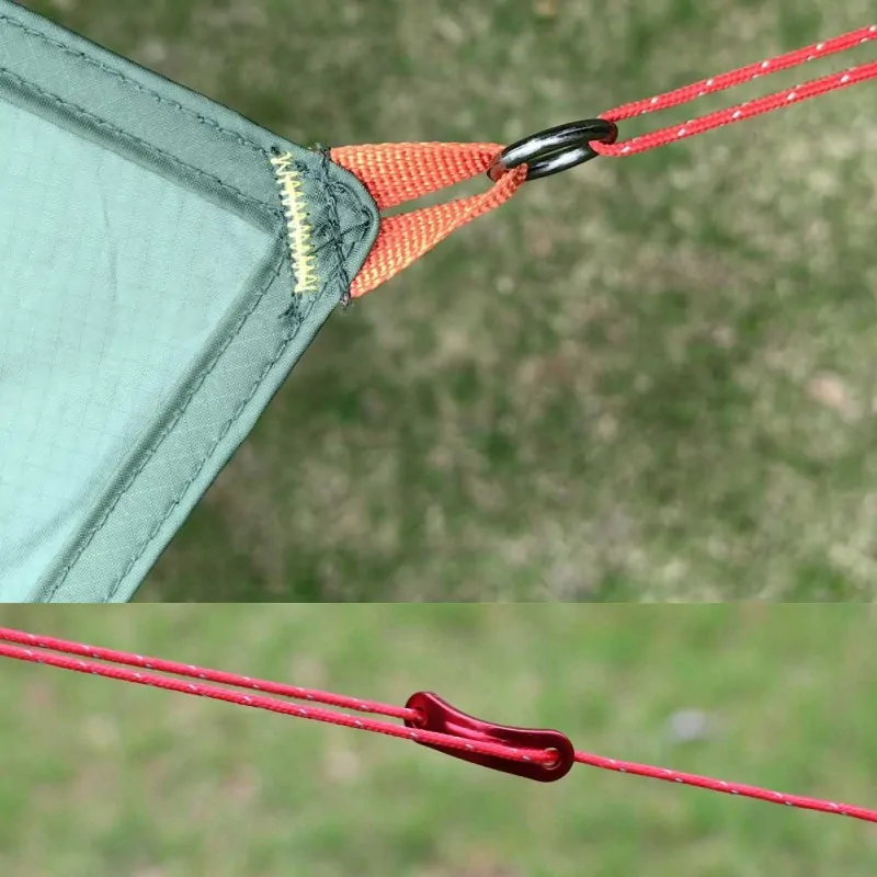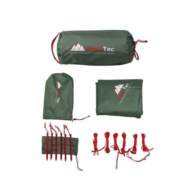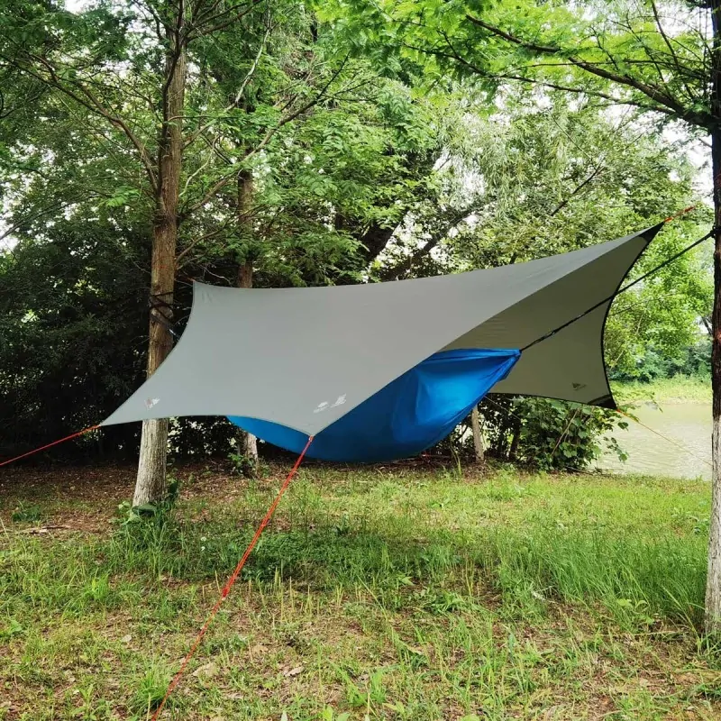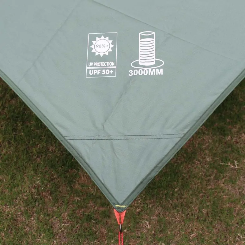 The Favour Fly tent by AlpinTec is specifically designed to fit most commercial hammocks. Additionally, you can have a comfortable picnic underneath it without worries. The Favour Fly can protect you comfortably from rain (3000mm waterproofing), sun (with UPF50+ protection against radiation), leaves, etc. It easily attaches at 2 points and is anchored with pegs and ropes to the ground. It weighs 700 grams. Its table-like shape allows air to circulate freely underneath, creating pleasant conditions without rain or sun. At the 4 attachment points to the ground, the Favour Fly tent has pockets for the installation ropes (included).