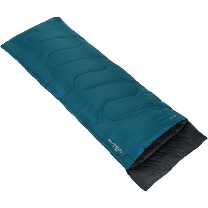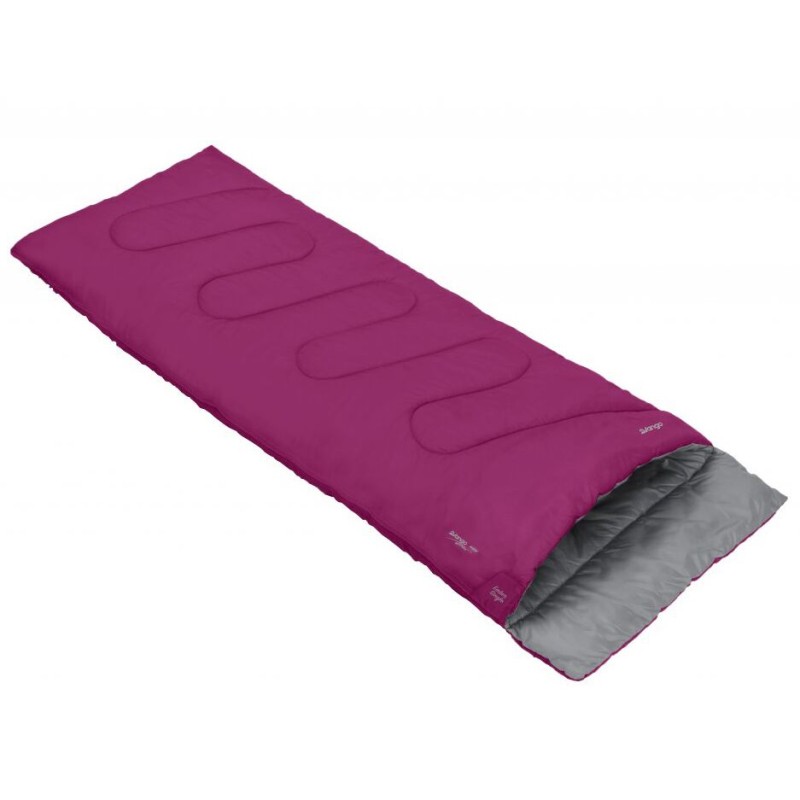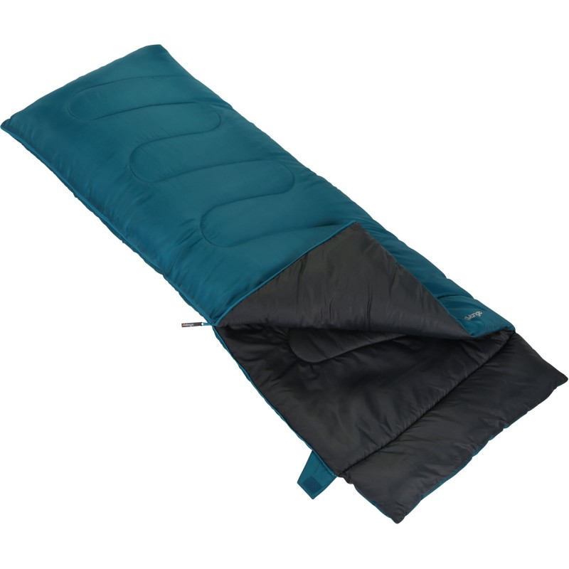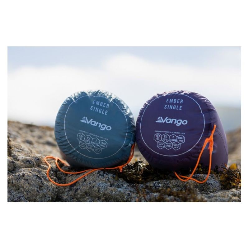 The Ember Summer Sleeping Bag by Vango with an integrated headrest for maximum comfort. It features a two-way zipper that can be opened from the top or bottom to increase ventilation and hanging loops for quick drying.