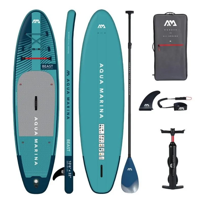 Aqua Marina SUP (Stand Up Paddle) inflatable board model Beast 10'6" in blue color. Specially designed for experienced paddlers aiming to dominate the open sea. Made with AQUA MARINA's exclusive Double Stringer technology, the Beast is 20% stiffer than other inflatable boards.