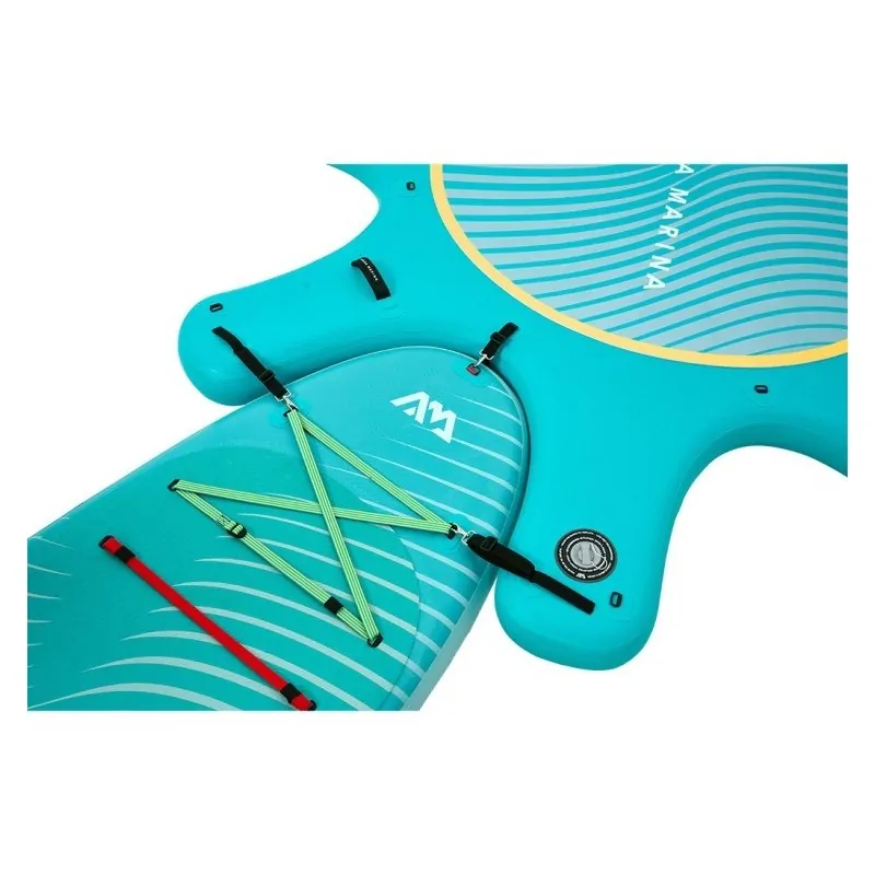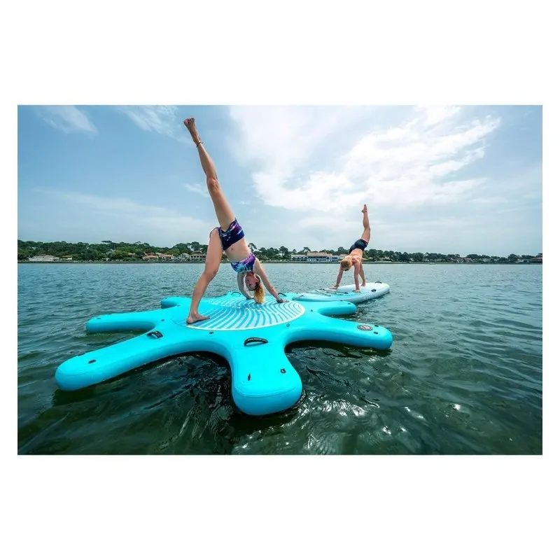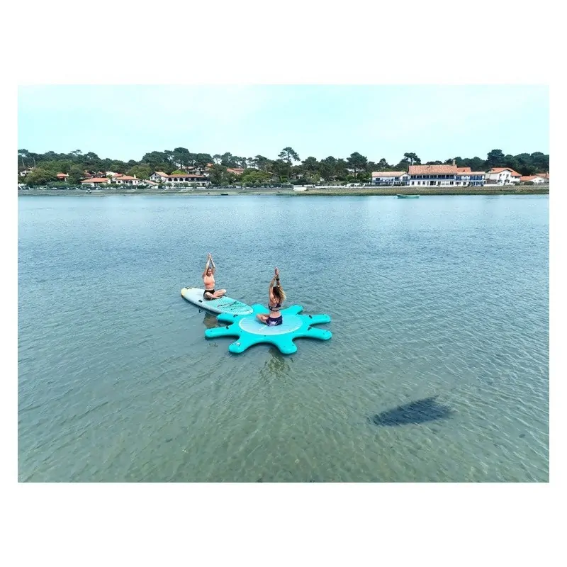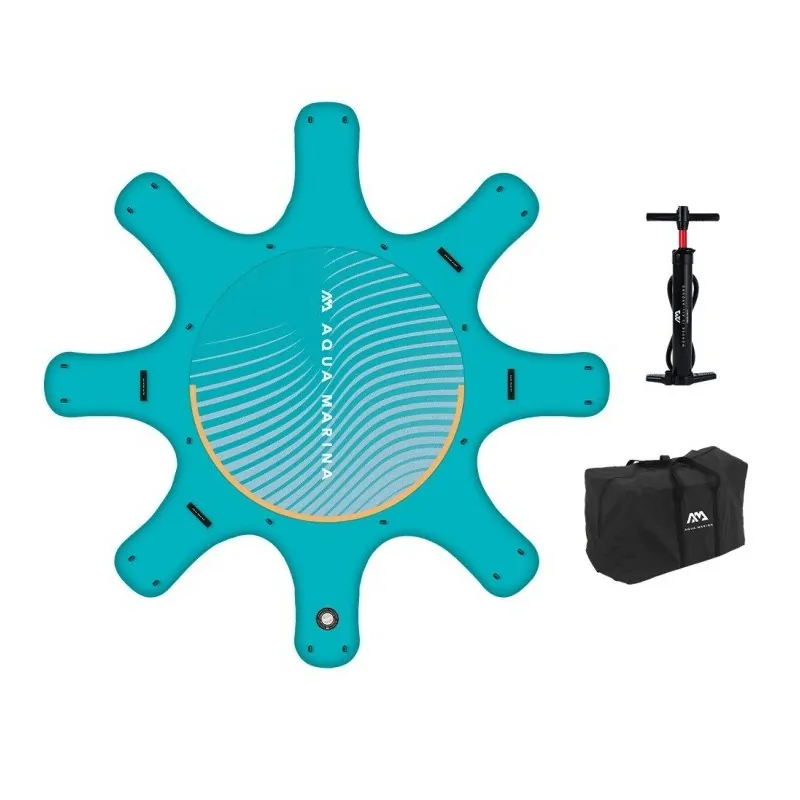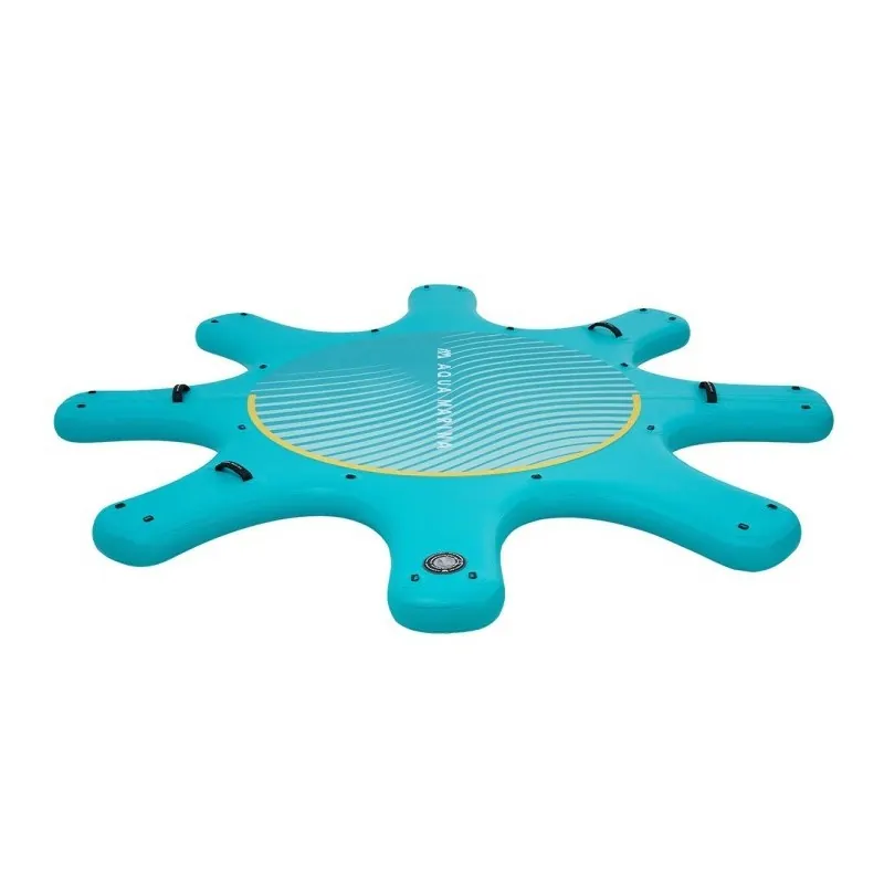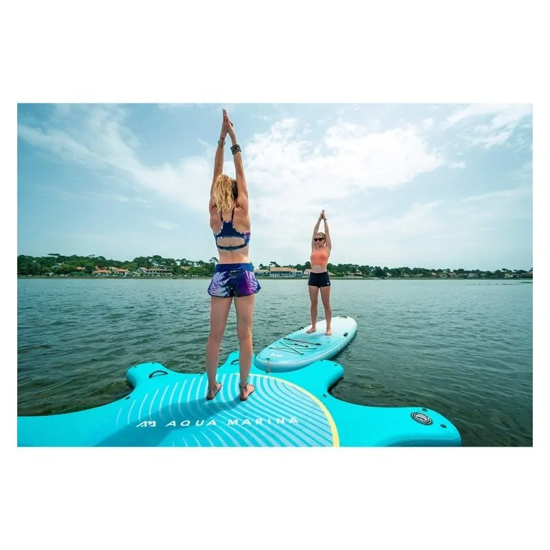 Aqua Marina inflatable beach board model Yoga Dock for Dhyana in blue color. It can accept up to 8 boards around the perimeter, with 3 tie points for each board. It is ideal for a Yoga instructor. It has a large surface of embossed non-slip EVA material with a sand texture for freedom of movement.