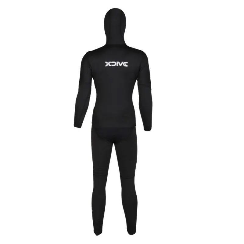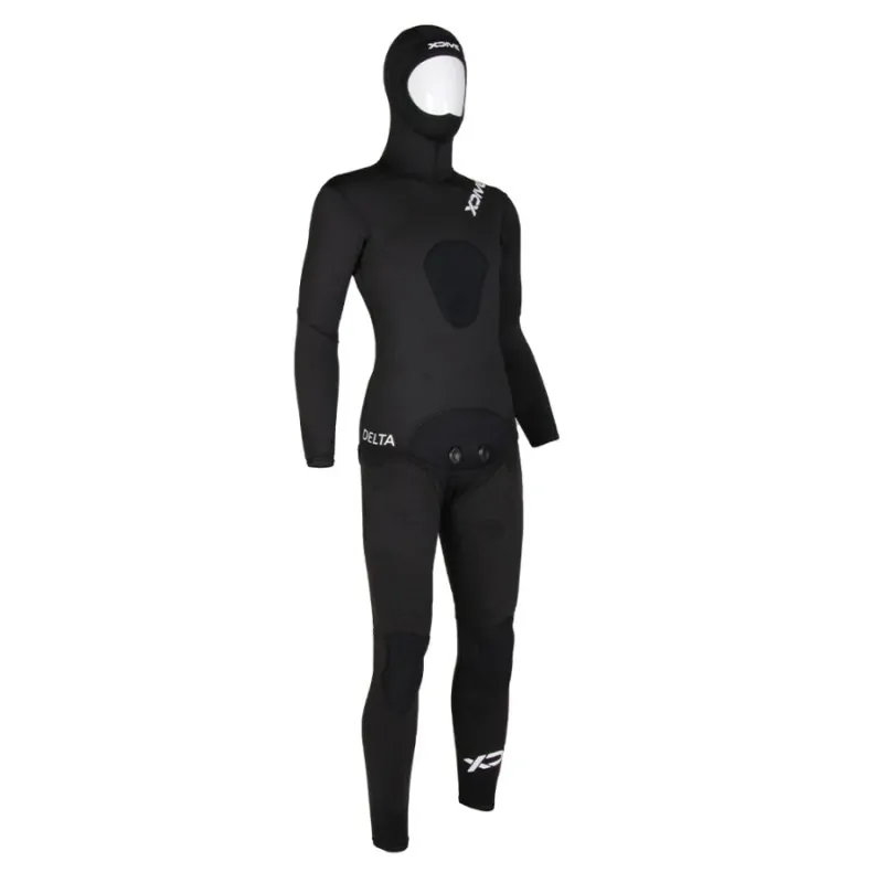 Στολή κατάδυσης μοντέλο Delta 5mm από την XDive σε χρώμα μαύρο με διπλώ κουμπώμα για κλείσιμο της “ουράς”, σακάκι χωρίς φερμουάρ και ενσωματωμένη κουκούλα.