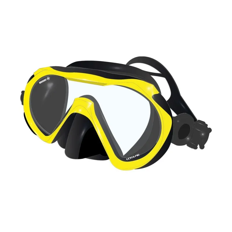 1Dive sea mask model by Beuchat, featuring a large internal volume with a frame in different color combinations such as black/yellow, black/red, black/blue.