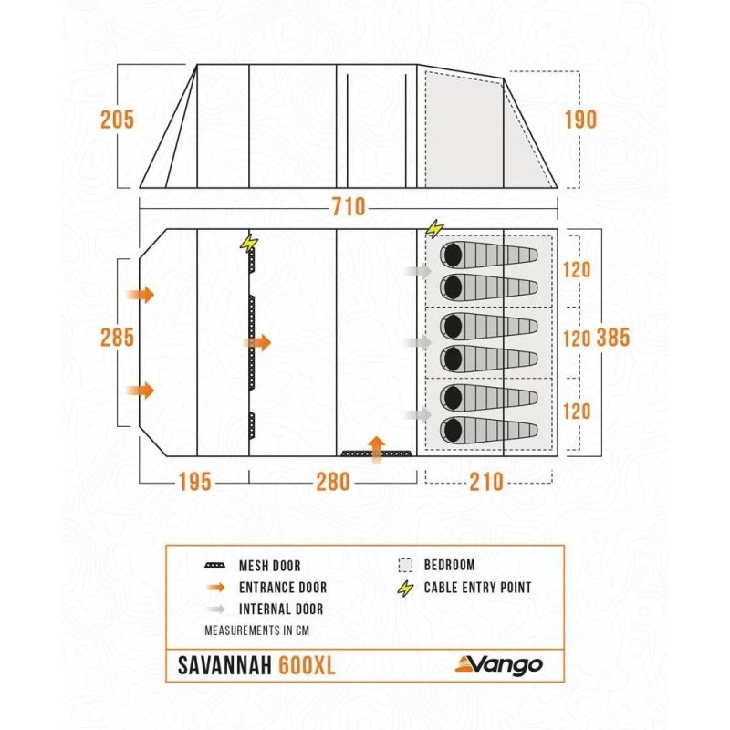 The Savannah 600XL is a 6-person tunnel tent with Powerflex® Fiberglass poles and an integrated canopy that provides additional living space. The fully sewn-in floor keeps moisture and bugs out, while ventilation in the tent can be adjusted using the mesh on the doors and AirZone panels.